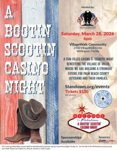 Each guest will receive play gaming chips and a raffle ticket upon arrival. Throughout the night, enjoy hot appetizers, delicious desserts, a cash bar, live country music, and a full play‑casino experience—with plenty of chances to win great prizes. Every moment of fun helps fuel our mission to support Palm Beach County veterans and their families, making your good time go even further. And don’t forget to show up in your best country flair to keep the Bootin’ Scootin’ spirit alive.